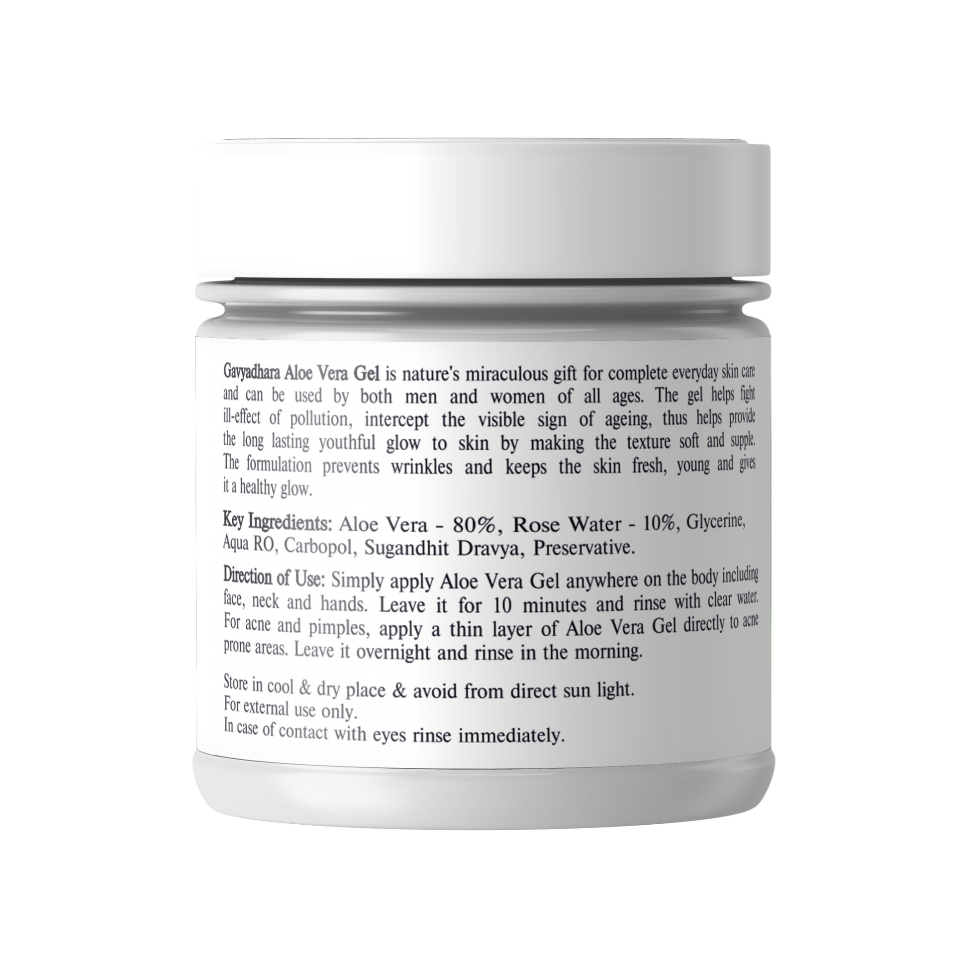 Gavyadhara Aloe Vera Moisturizing Gel with Rose Ark Natural Hydration amp Skin Nourishment Gavyadhara presents premium quality Aloe Vera Moisturizing Gel infused with the goodness of pure Rose Ark for deep skin hydration and nourishment. With 80% pure Aloe Vera extract and 10% pure Rose Water, this gel offers a refreshing and soothing experience for all skin types. Formulated with natural, chemical-free ingredients, it helps restore skin s moisture, reduce irritation, and promote a healthy, radiant glow. The blend of Aloe Vera and Rose Water works effectively to soothe, hydrate, and rejuvenate the skin, making it an essential addition to your daily skincare routine. Key Benefits Deep Hydration amp Moisturization Aloe Vera provides long-lasting hydration, keeping the skin soft and supple. Soothes amp Calms the Skin Reduces inflammation, irritation, and redness, making it ideal for sensitive and acne-prone skin. Enhances Skin Radiance Rose Ark helps brighten the skin tone, leaving it fresh and glowing. Lightweight amp Non-Greasy Absorbs quickly without leaving a sticky residue, perfect for daily use. Natural Skin Healing Helps in reducing sunburns, acne scars, and blemishes with regular application. Multipurpose Use Can be used as a face moisturizer, after-sun gel, primer, or hair conditioning treatment. Suitable for All Skin Types Works well for dry, oily, combination, and sensitive skin. How to Use For Face amp Skin Take a small amount and gently massage onto the face and skin until absorbed. Use morning and night for best results. For Hair amp Scalp Apply as a natural hair conditioner to reduce dryness and promote shine. As a Primer Use before makeup for a smooth and hydrated base. For Sunburn Relief Apply a generous layer on affected areas to soothe and heal sun-exposed skin. Gavyadhara Aloe Vera Moisturizing Gel with Rose Ark is a perfect natural skincare solution for hydration, soothing, and skin nourishment. Add it to your daily routine for a refreshed, glowing, and healthy complexion