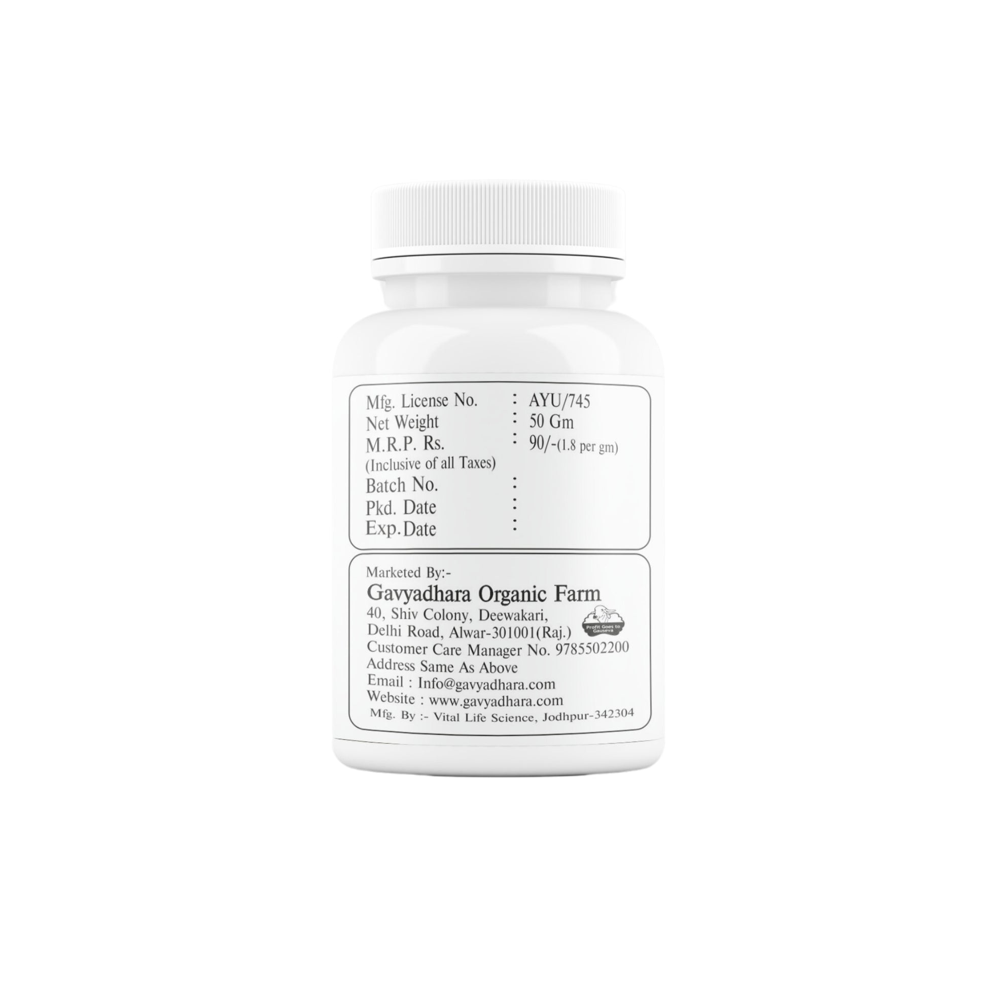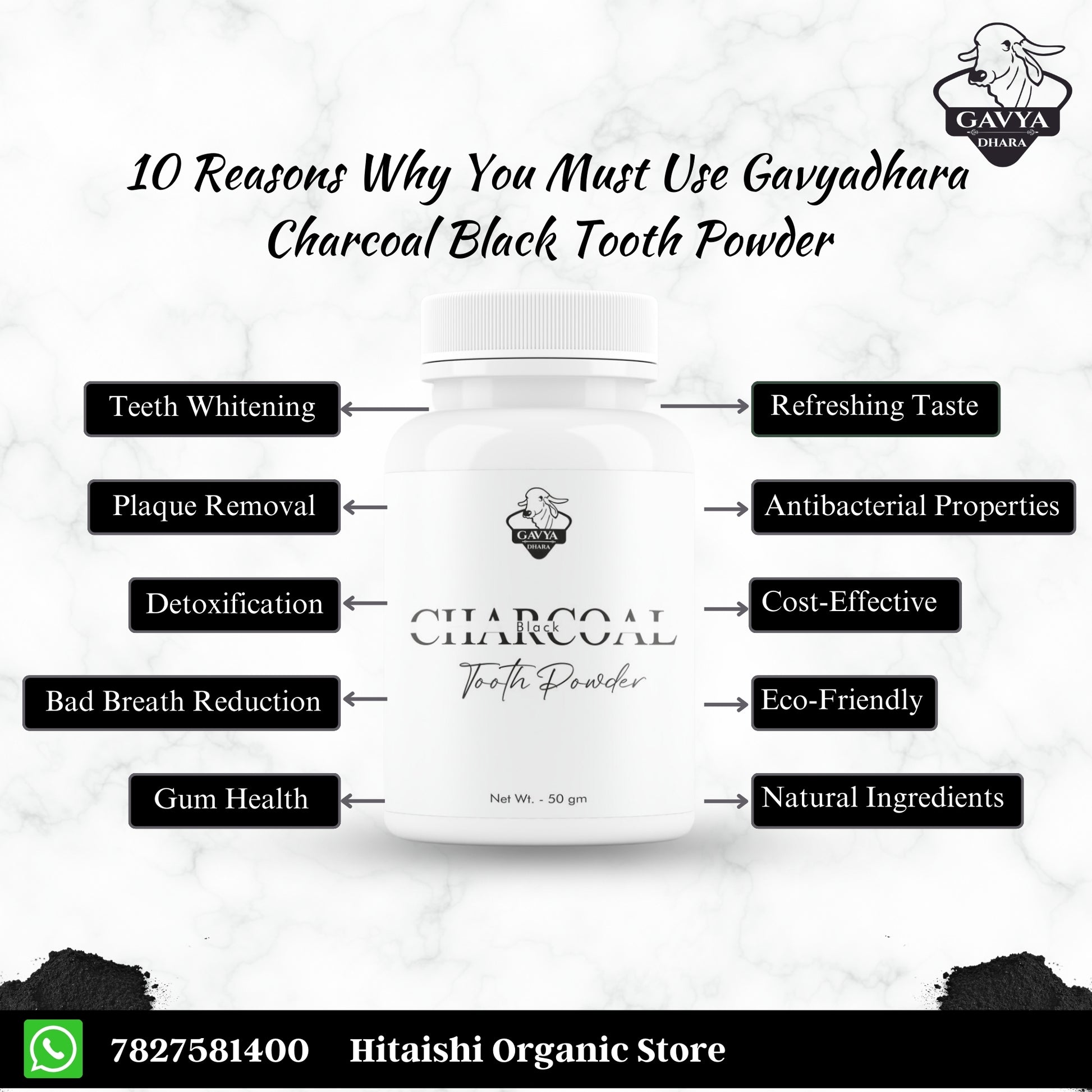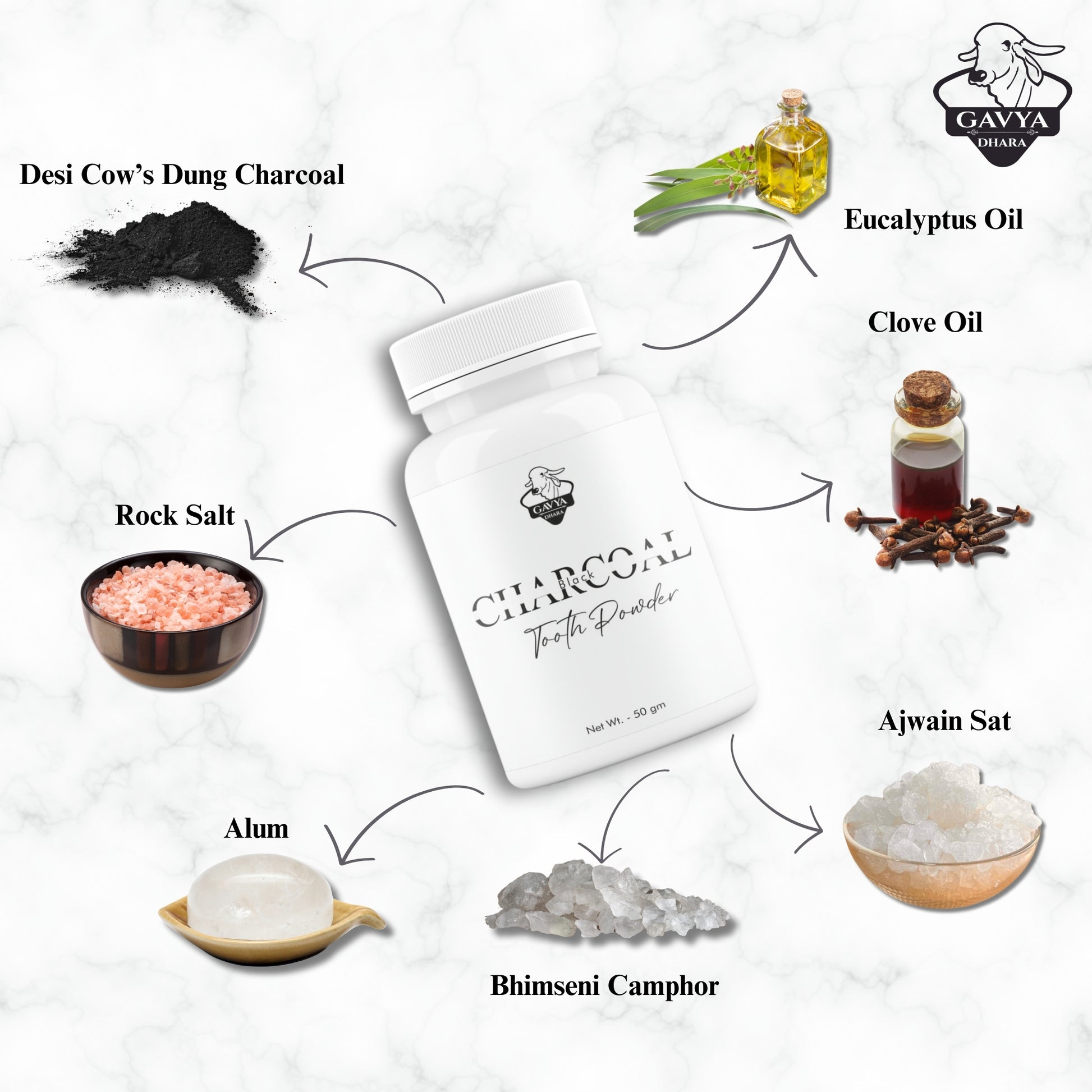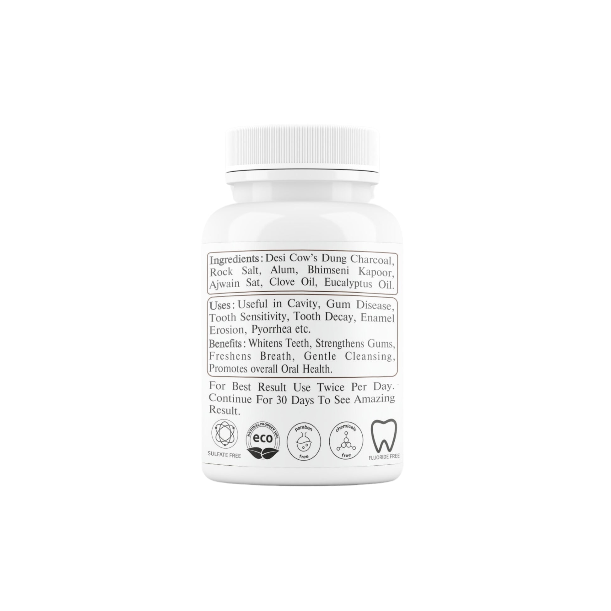 Our all-natural Gavyadhara Charcoal Tooth Powder, the perfect alternative to chemically processed toothpaste and tooth powder. Made with only the finest natural ingredients, Gavyadhara Charcoal Tooth Powder is designed to effectively clean your teeth and freshen your breath without any chemicals. Gavyadhara Charcoal Tooth Powder is made with a blend of natural ingredients, including Desi Cow Dung s Charcoal. These ingredients work together to gently polish away surface stains and plaque, leaving your teeth feeling clean and smooth. In addition to its cleaning power, Gavyadhara Charcoal Tooth Powder also contains Bhimseni Camphor that freshen your breath and leave your mouth feeling refreshed. The combination of Clove Oil and Ajwain Sat provides a natural, minty flavor that will leave your mouth feeling clean and invigorated. Uses Useful in Cavity Gum Disease Tooth Sensitivity Tooth Decay Enamel Erosion Pyorrhea Benefits Whitens Teeth Strengthens Gums Freshens Breadth Gentle Cleansing Promotes overall Oral Health. Ingredients Desi Cow Dung Charcoal, Rock Salt, Alum, Bhimseni Kapoor, Ajwain Sat, Clove Oil, Eucalyptus Oil