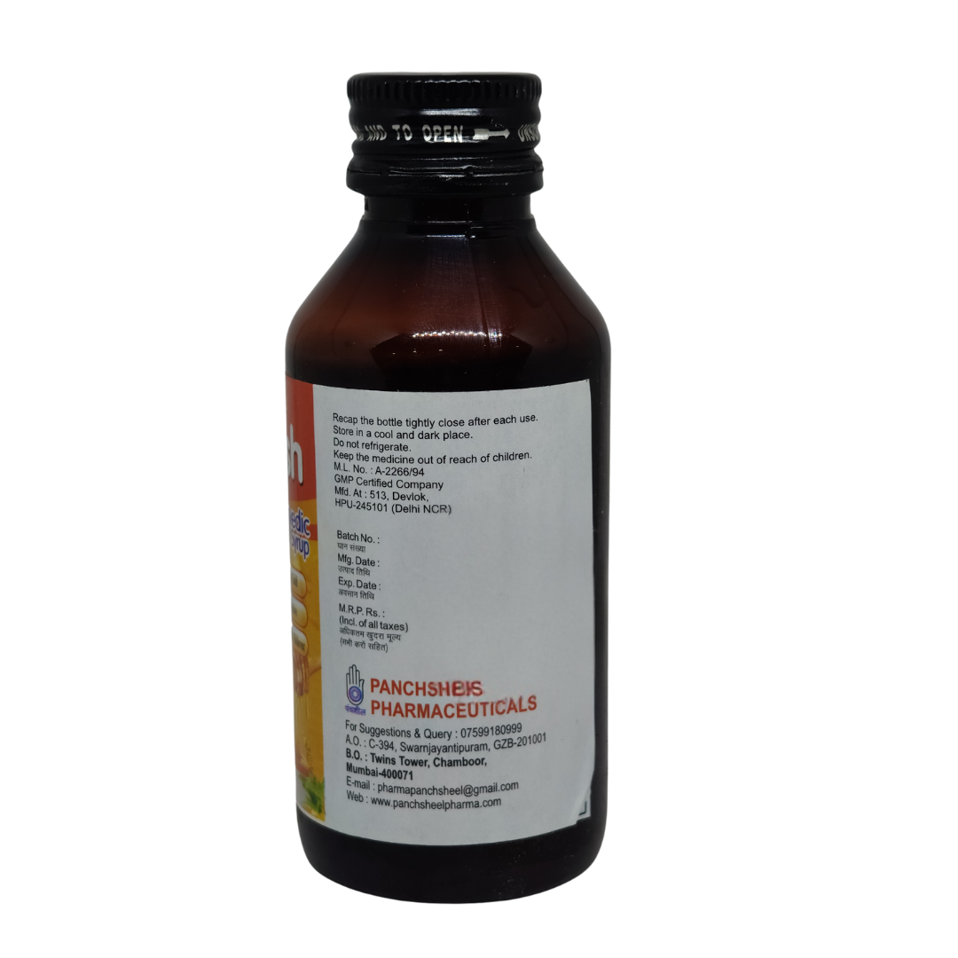 Panchsheel Kufnash Syrup is a powerful Ayurvedic formulation designed to provide natural relief from cough, cold, and respiratory disorders. Made with a blend of time-tested herbal ingredients, this syrup helps in soothing the throat, reducing mucus buildup, and relieving congestion and respiratory discomfort. Whether it is a dry cough, wet cough, allergic cough, or congestion due to cold, Kufnash Syrup works effectively to ease irritation and promote healthy breathing. Formulated with natural expectorants and soothing herbs, Panchsheel Kufnash Syrup helps in managing bronchial conditions, throat irritation, and seasonal allergies, ensuring long-lasting relief without side effects. Key Benefits Provides quick relief from cough and soothes dry, wet, and allergic cough Clears mucus and relieves congestion by acting as a natural expectorant Eases respiratory discomfort and supports easy breathing Strengthens the respiratory system and boosts immunity against infections Soothes sore throat and reduces irritation 100% Ayurvedic and herbal solution Safe for all age groups, including adults, children, and the elderly Powerful Ayurvedic Ingredients Basa A natural bronchodilator that helps relieve congestion and improve breathing Pipli (Long Pepper) Acts as a powerful expectorant, promoting mucus clearance Kanthkari Traditionally used to soothe the throat and treat respiratory ailments Kali Mirch (Black Pepper) Helps in reducing throat irritation and boosting immunity Mulethi (Licorice) Soothes throat inflammation, reducing cough frequency Kakda Singi Supports lung health and reduces allergic reactions Kooth Known for its anti-inflammatory and bronchodilator properties, helps in cough relief Honey Acts as a natural cough suppressant while soothing the throat Sounth (Dry Ginger) Provides warmth to the respiratory system, helping to loosen mucus Lisoda Effective in clearing phlegm and relieving congestion Banafsha (Viola Odorata) Helps in reducing throat irritation and soothing cough Tulsi (Holy Basil) A natural immunity booster that helps in fighting respiratory infections Karpoor (Camphor) Provides a cooling effect and aids in opening nasal passages Pudina Satv (Menthol Extract) Helps in relieving blocked nose and chest congestion Sugar Base Q.S. Enhances taste and makes the syrup palatable for all age groups Dosage amp Usage Instructions Adults Take 2 teaspoons (10ml) twice a day Children - 1 2 teaspoon (2.5ml) twice a day For persistent or chronic cough, use regularly for optimal results or as directed by the physician. Who Should Use Panchsheel Kufnash Syrup Individuals suffering from dry, wet, or allergic cough Those experiencing throat irritation, congestion, and mucus buildup People with seasonal allergies and respiratory discomfort Those looking for a natural, chemical-free alternative to cough syrups Individuals seeking bronchial and lung health support Why Choose Panchsheel Pharma Kufnash Syrup 100% Ayurvedic and herbal formula Fast and effective cough relief No drowsiness or side effects Trusted Panchsheel Pharmaceuticals product Safe for long-term use Experience natural and lasting relief from cough and respiratory issues with Panchsheel Kufnash Syrup and breathe easy every day.